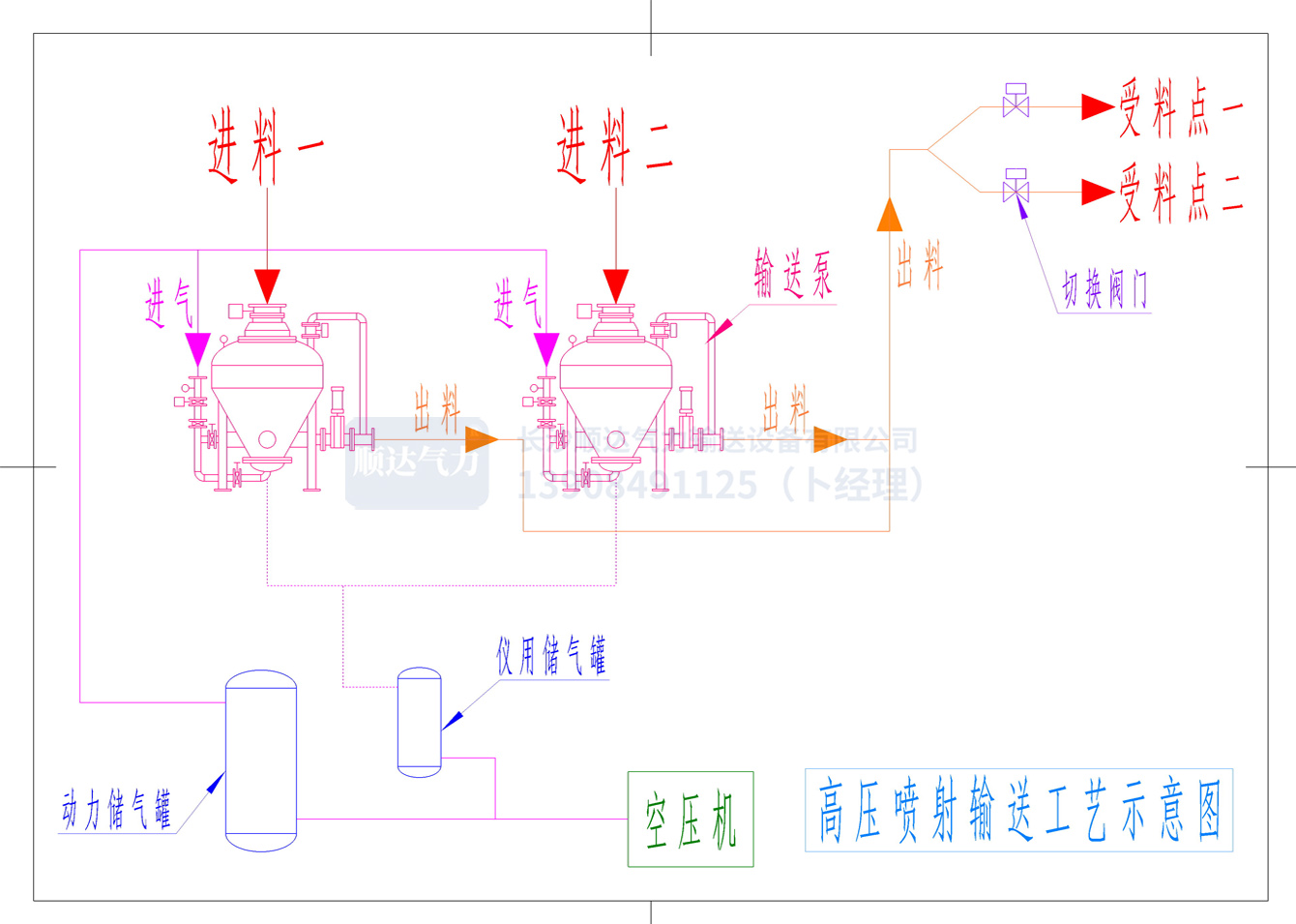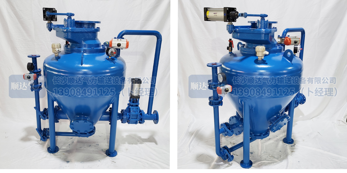 QPBLL系列氣化噴射泵。以空壓機(jī)作為動力氣源,系統(tǒng)先打開氣動排氣閥,物料經(jīng)專用氣動進(jìn)料閥進(jìn)入主泵體,再關(guān)閉專用氣動進(jìn)料閥和氣動排氣閥,然后打開氣動進(jìn)氣閥,再打開專用氣動出料閥,運(yùn)用氣固兩相流原理,以流態(tài)化技術(shù),射流技術(shù)和壓差原理相結(jié)合,物料在主泵體流態(tài)化的同時將物料以懸浮流狀態(tài)沿管道送入受料倉內(nèi),經(jīng)受料倉內(nèi)布袋除塵器過濾后料氣分離,物料自由落入受料倉,空氣排入大氣,完成輸送過程。